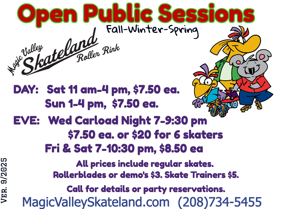 Join us for our annual super-fun costume party. Prizes for best costumes. Everyone receives a door-prize gift. Raffles for new skates and an overnight stay at Jackpot (adult’s only for Jackpot).
